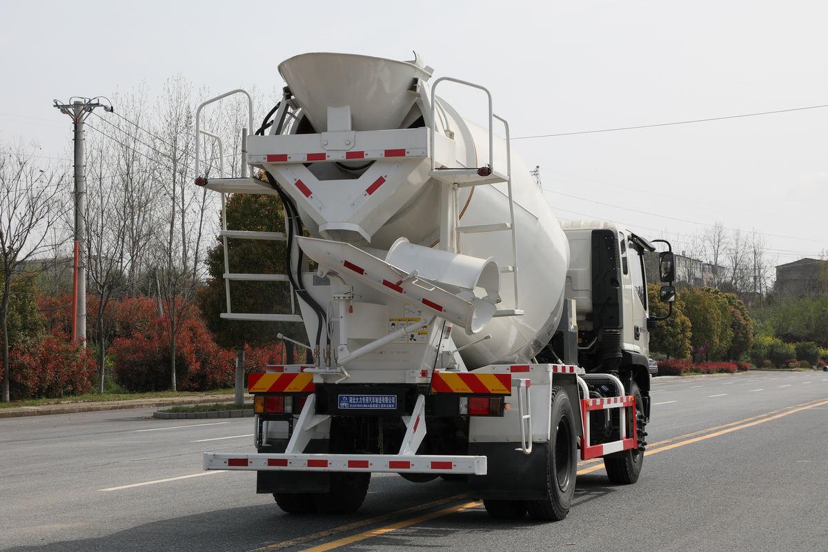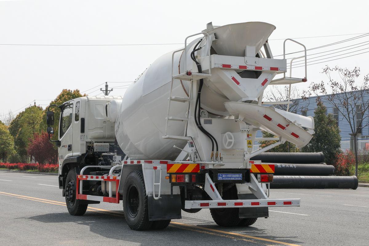 What makes this model stand out for small urban jobs is its compact 4.5m³ mixing drum and user-friendly design. The drum is made from Q345B high-strength steel (lightweight to save fuel, yet durable enough for daily small-batch use) with a basic anti-stick coating—easy to clean even with limited on-site water, which is common in crowded urban areas. Its single-pump hydraulic system delivers 18 kW of power to the drum, enabling fast loading (under 6 minutes at small batching plants) and steady discharging (0.8 m³/min)—just right for filling small foundation forms without waste. To fit urban constraints, it has a compact 200L water tank (mounted under the frame to save space) for drum flushing and a low-profile drum design that avoids overhead obstacles like tree branches or power lines near residential sites. Underneath, a lightweight but reinforced single-layer frame (200×70×8mm) and 7/9-leaf spring suspension absorb bumps from city potholes, protecting the drum and preventing concrete sloshing during stop-and-go traffic.