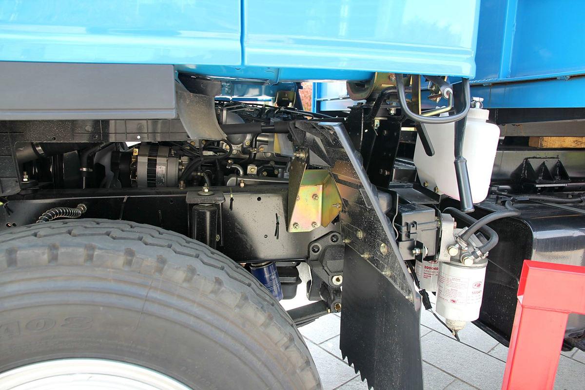 What makes this model stand out for small-business use is its 4m×2.0m×1.2m dump body and commercial-grade durability. Constructed from Q345B high-strength steel (tougher than the Q235 used in basic models), the body resists dents from dropped tools or stacked materials, while its 4-ton payload capacity hits the sweet spot for small commercial jobs—enough to avoid multiple trips, but not so much that it wastes fuel on empty space. The hydraulic lifting system uses a reliable single-pump design (easy to service with basic tools) that raises a full load in 21 seconds—fast enough to keep up with back-to-back delivery stops during morning rush hour. Underneath, a reinforced single-layer frame (190×65×6mm) and 6/8-leaf spring suspension absorb bumps from potholed commercial streets, protecting both the cargo (like fragile drywall) and the truck’s chassis during daily use. It also features heavy-duty rear mud flaps and a corrosion-resistant fuel tank—built to withstand the wear of daily urban driving, not just occasional use.