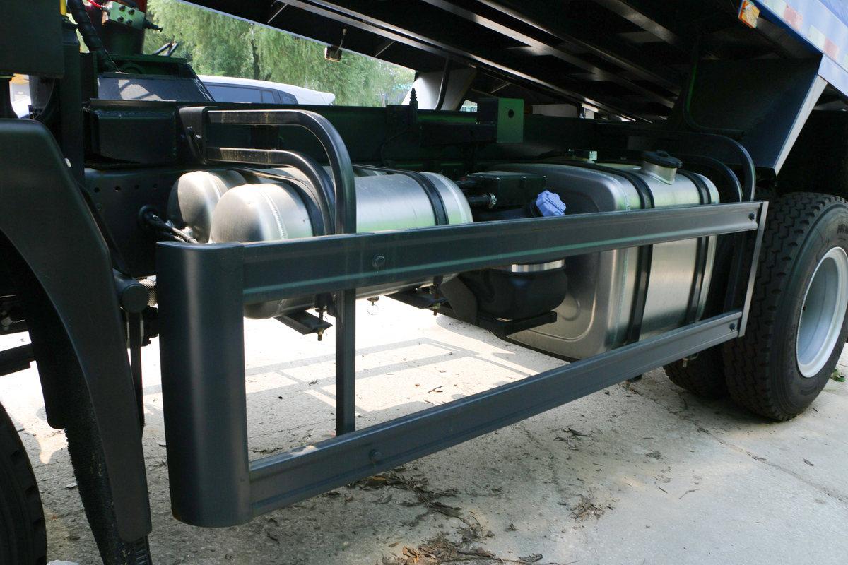 What makes this hybrid version stand out for micro-tasks is its 3.75m×2.05m×1.15m ultra-compact dump body—designed for “small but frequent” loads rather than bulk hauls. Made from Q345B steel with a thin, anti-rust coating (perfect for wet renovation waste or damp soil), the body weighs 20% less than standard small dump bodies, which helps cut fuel use. It has a rated payload of 6.2 tons (with a 11.99-ton Gross Vehicle Weight)—enough to carry 2-3 truckloads of drywall scraps from a 3-bedroom renovation, or a full load of gravel for repairing a 10-meter section of sidewalk. The best part? Its low 1.05-meter loading height means workers can shovel materials directly into the body without ladders or small loaders—saving 15-20 minutes per load, a big win for tight daily schedules. Underneath, a lightweight 180×65×5mm single-layer frame and 6/8-leaf spring suspension keep the ride steady over potholes, so loose debris like nails or small stones don’t bounce out during transport.